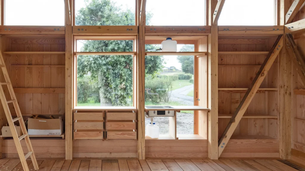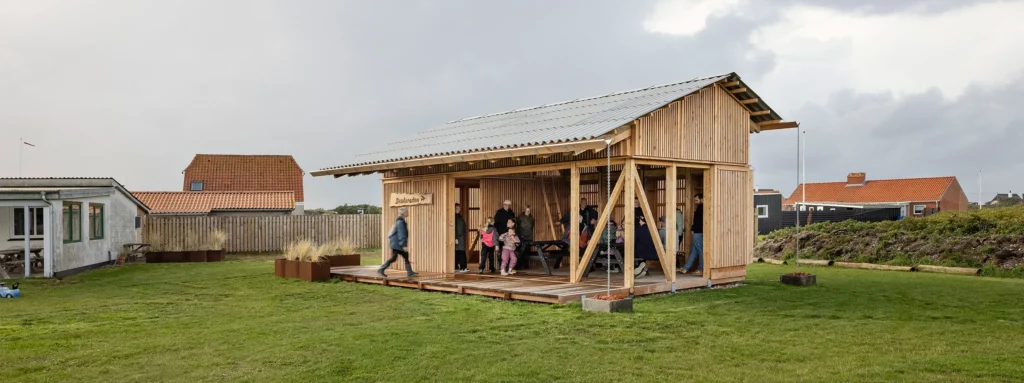 Mødestederne består af fire forskellige typer fælleshuse, bygget af genbrugs- og resttræ. De er enkle og åbne bygninger, der danner rammen om alt fra fællesspisning og kreative værksteder.